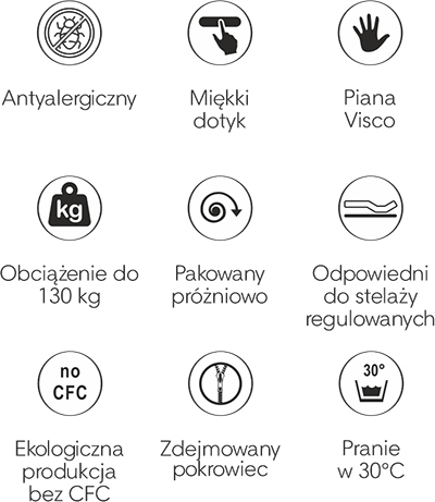 Materac Sofia to materac antyalergiczny. Jest miękki w dotyku. Przy jego produkcji zastosowano nowoczesną pianę Visco. Przystosowany jest do obciążenia do 130 kg. Pakowany próżniowo. Odpowiedni do wszystkich typów stelaży, w tym do stelaży regulowanych. Produkowany ekologicznie (bez CFC). W komplecie – zdejmowany pokrowiec (można go prać w temperaturze 30°C).