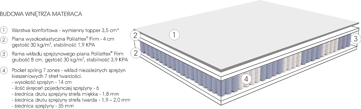 - Warstwa komfortowa – wymienny topper to 3,5 cm